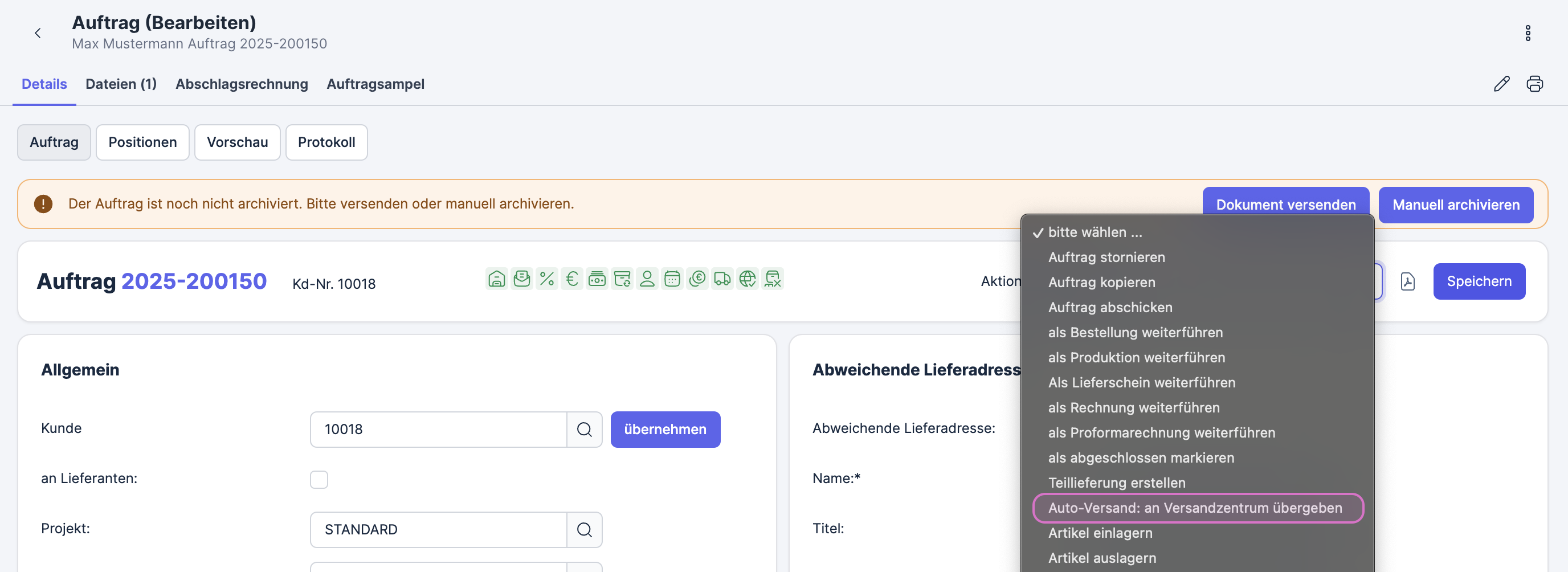 Gehe wie folgt vor, um einen einzelnen Auftrag an den Auto-Versand zu übergeben: