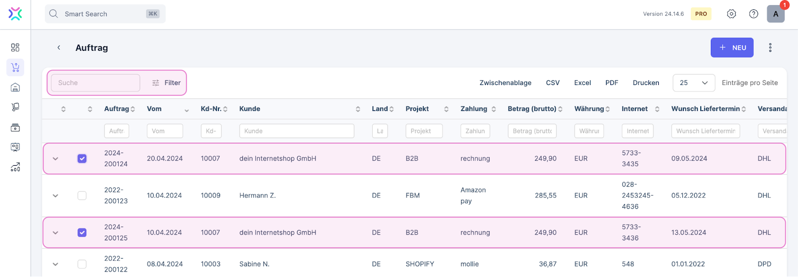 Wähle in der Auftragsübersicht die Aufträge aus, die du zusammenführen möchtest. Werden nicht alle gewünschten Aufträge auf der ersten Seite angezeigt, verwende die Filter- und Suchoptionen, um nach den gewünschten Aufträgen zu suchen.