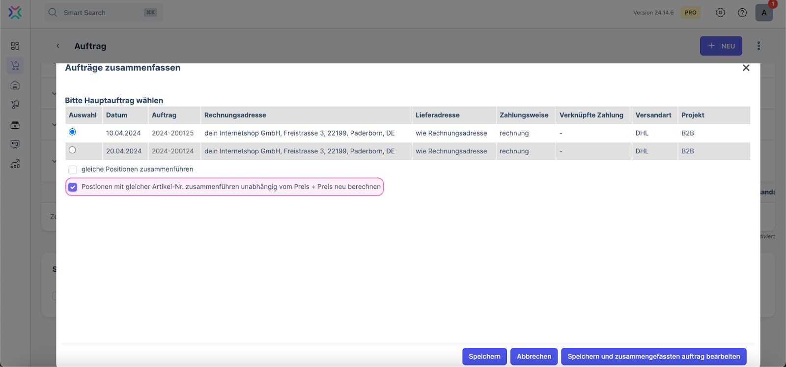 Setze ein Häkchen bei Positionen mit gleicher Artikel-Nr. zusammenführen unabhängig vom Preis + Preis neu berechnen, wenn du identische Artikel in einer Zeile zusammenführen möchtest auch wenn die Preise unterschiedlich sind.