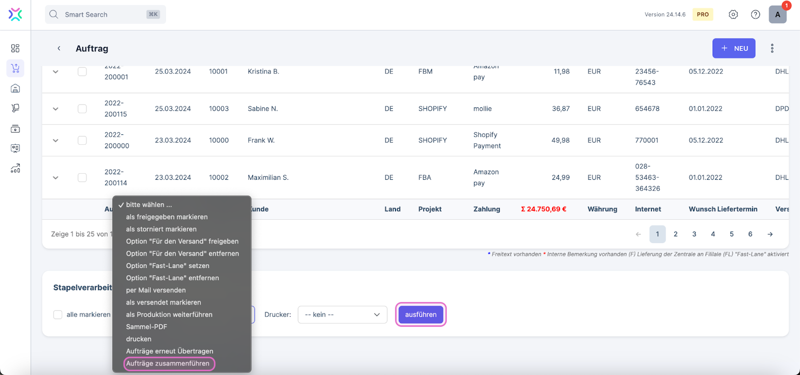 Wähle im Bereich Stapelverarbeitung die Option Aufträge zusammenführen aus dem Drop-down und klicke auf ausführen. Das Formular Aufträge zusammenfassen wird angezeigt.