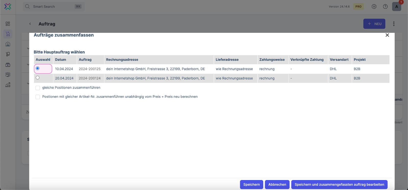 Wähle in der Spalte Auswahl den Auftrag aus, den du als Auftrag behalten möchtest. Die Artikel aus den anderen Aufträgen werden dann in diesen Auftrag übernommen.