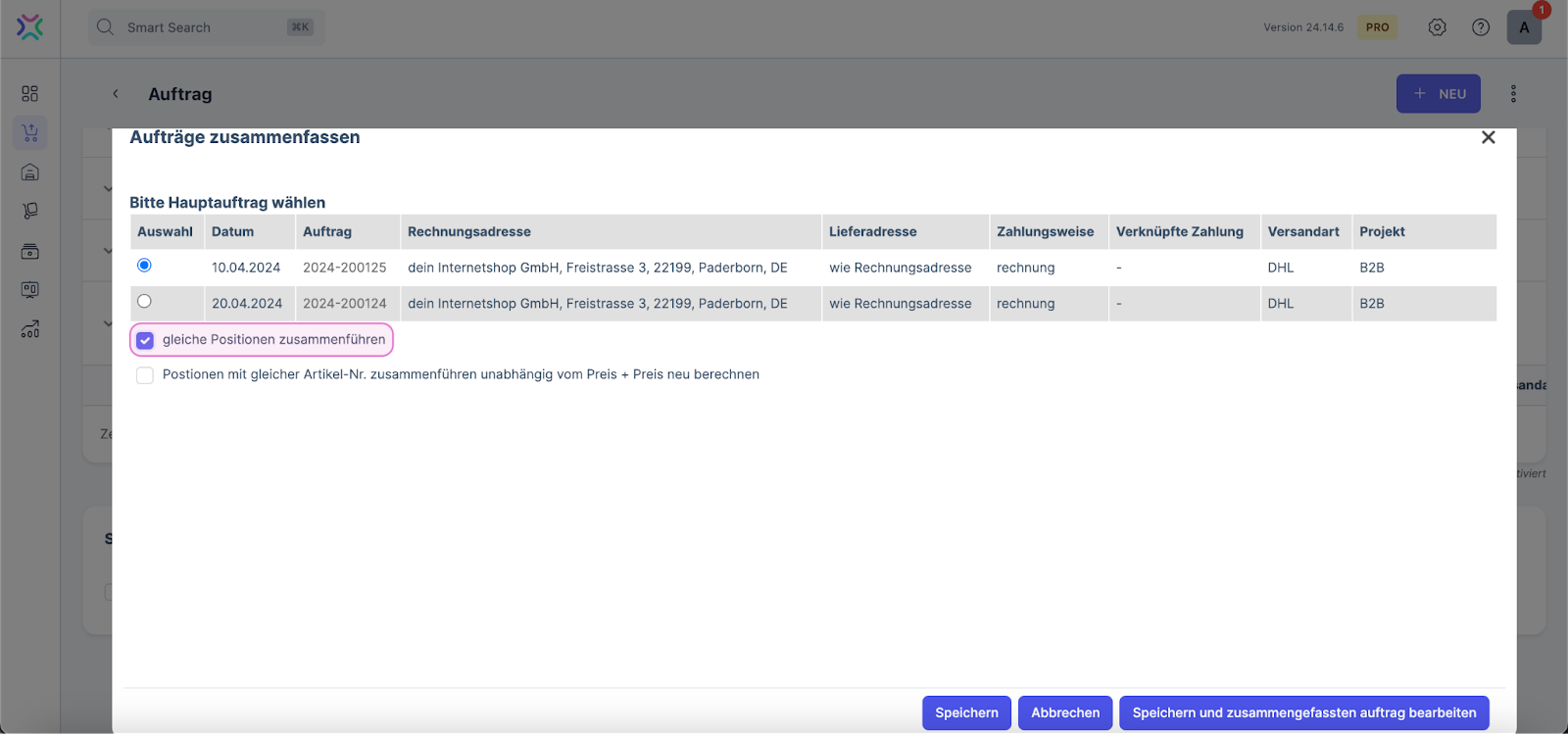 Zum Zusammenführen einzelner Aufträge eines Kunden gehst du folgendermaßen vor: