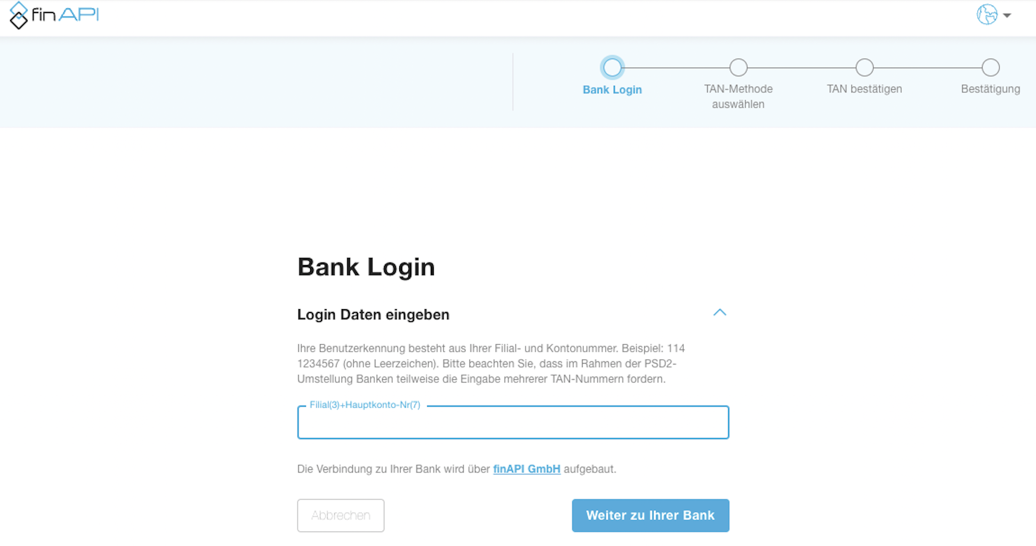 Klicke auf Wechsel zur PSD2-Anbindung, um die Autorisierung zu beginnen. Du wirst automatisch zur finAPI-Anmeldeseite weitergeleitet.