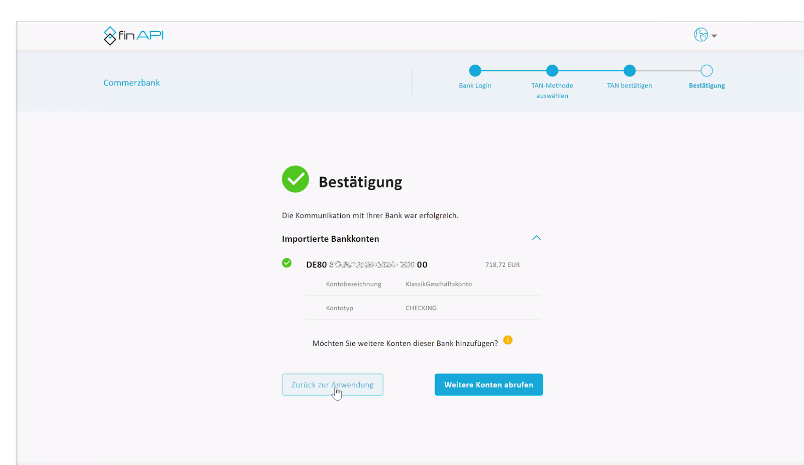 Hat finAPI deine Bankinformationen erfolgreich abgerufen, wird eine Bestätigung angezeigt. Nun wähle zwischen den folgenden Optionen: