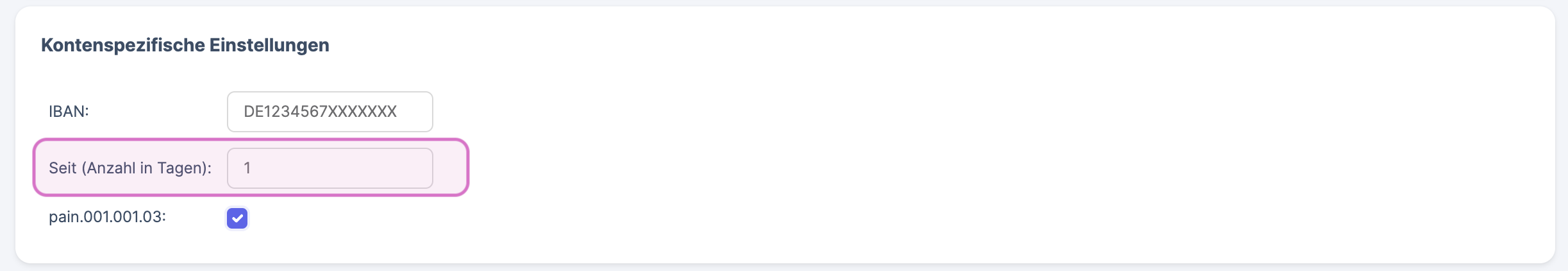 Bereich Kontenspezifische Einstellungen > Feld IBAN