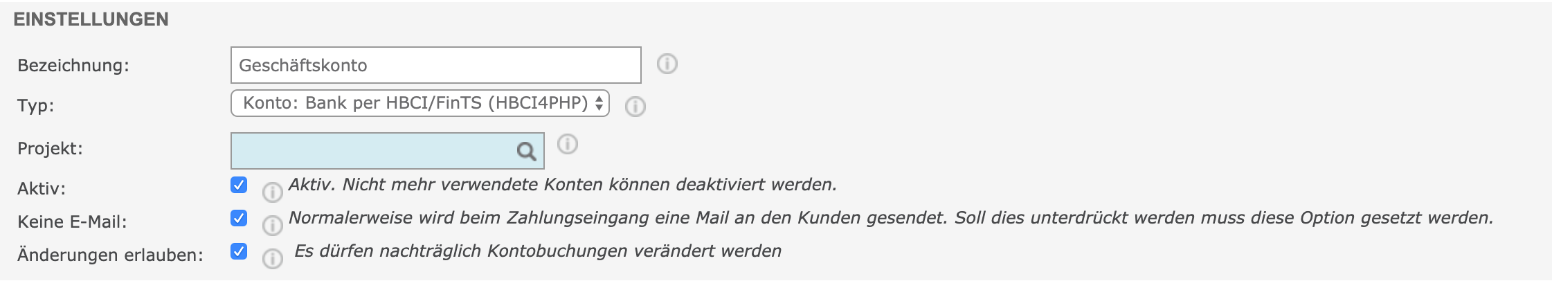 Für HBCI/FinTS (HBCI4PHP): Setze ein Häkchen bei Einzelbuchungen aktivieren im Bereich Kontenspezifische Einstellungen.