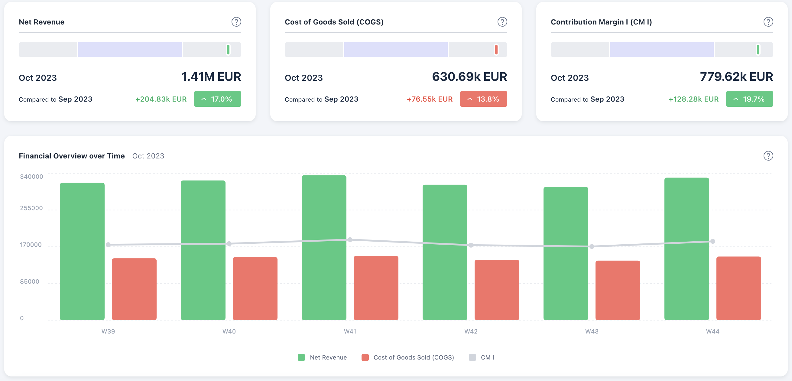 The Revenue analysis gives you important insights into your revenue and helps you make data-driven decisions to increase your growth and profitability. The comprehensive analysis of your net revenue, your cost of goods sold (COGS), and the contribution margin (CM) helps you with this. You can filter your data by different perspectives, e.g., product, country, and project. This allows you, among other things, to determine differences between countries and projects, identify trends, and find out which product sells best on a specific sales channel.