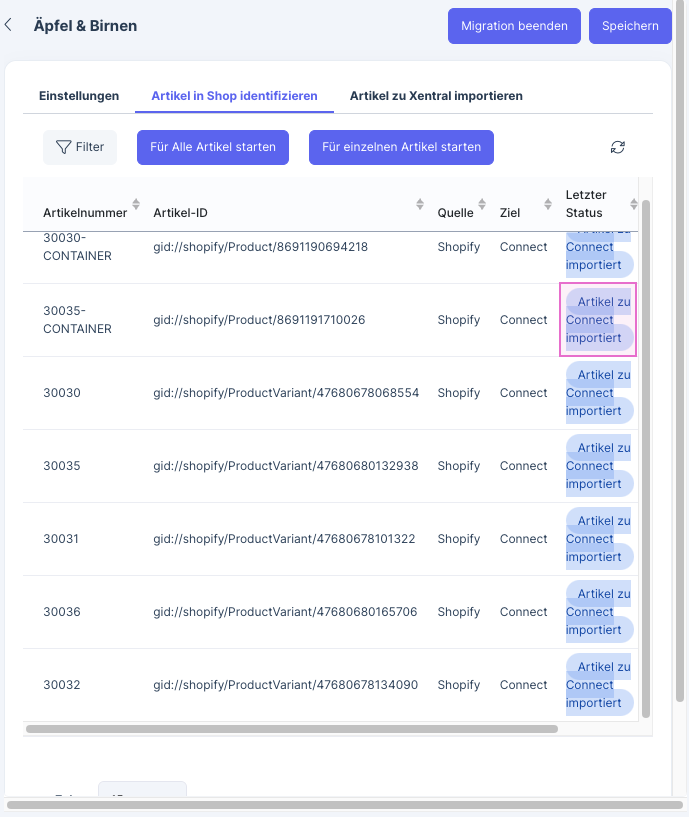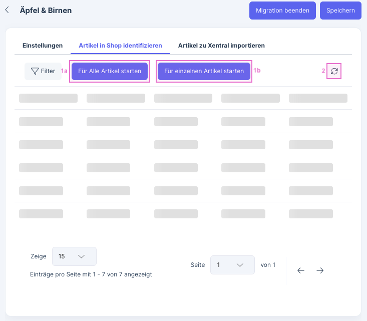 Um Artikel zu importieren, klicke auf (1a) Für Alle Artikel starten bzw. auf (1b) Für einzelnen Artikel starten und gib ggf. eine Shopify-SKU ein. Aktualisiere die Anzeige mit Neu Laden (2). Sobald der Import startet, wird die Schaltfläche Migration beenden bis zum Abschluss der Migration ausgegraut.