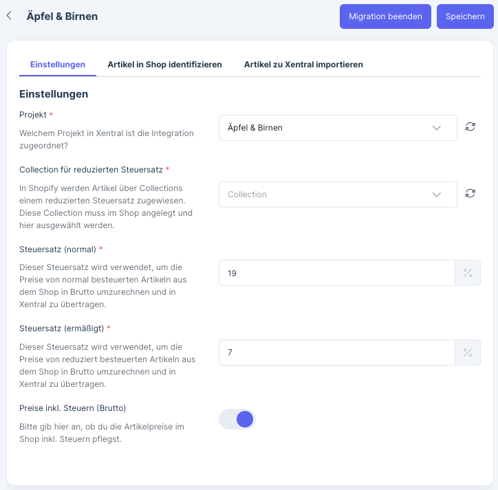 Preise inkl. Steuern (Brutto): Stelle den Schalter auf rechts, wenn du im Shop Bruttopreise gepflegt hast und auf links für Nettopreise.
