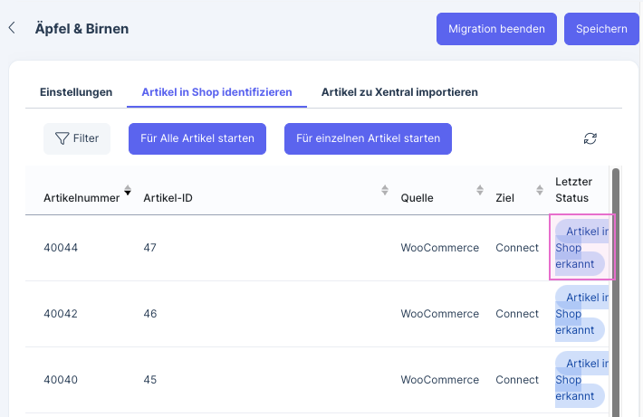 Du kannst die Migration beenden, wenn die Schaltfläche wieder aktiv ist. Solange du diese Schaltfläche noch nicht geklickt hast, kannst du auch später nochmal zurückkehren und ggf. weitere Artikel importieren.