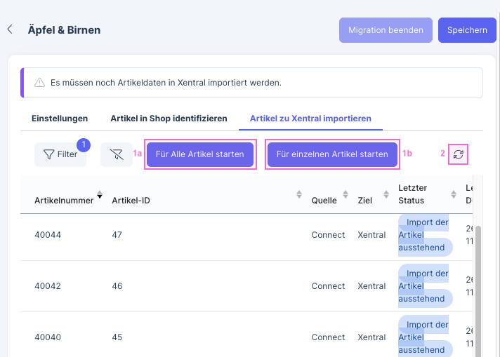 Um Artikel zu importieren, klicke auf (1a) Für Alle Artikel starten bzw. auf (1b) Für einzelnen Artikel starten und gib ggf. eine WooCommerce-Artikelnummer ein. Aktualisiere die Anzeige mit Neu Laden (2). Sobald der Import startet, wird die Schaltfläche Migration beenden bis zum Abschluss der Migration ausgegraut.