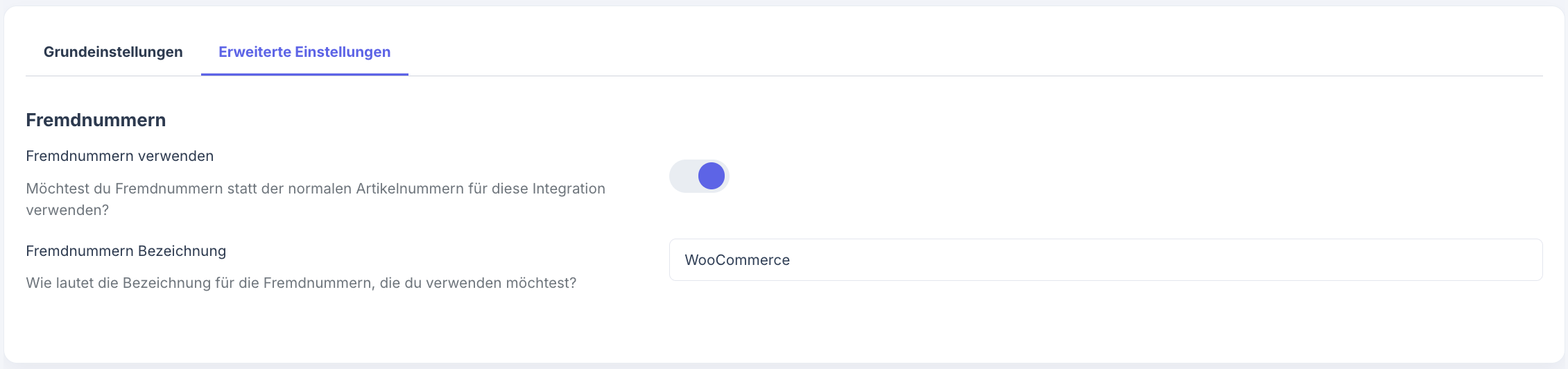 Im Reiter Erweiterte Einstellungen kannst du die Verknüpfung der Artikel über Fremdnummern (statt über Artikelnummern/SKUs) freischalten .