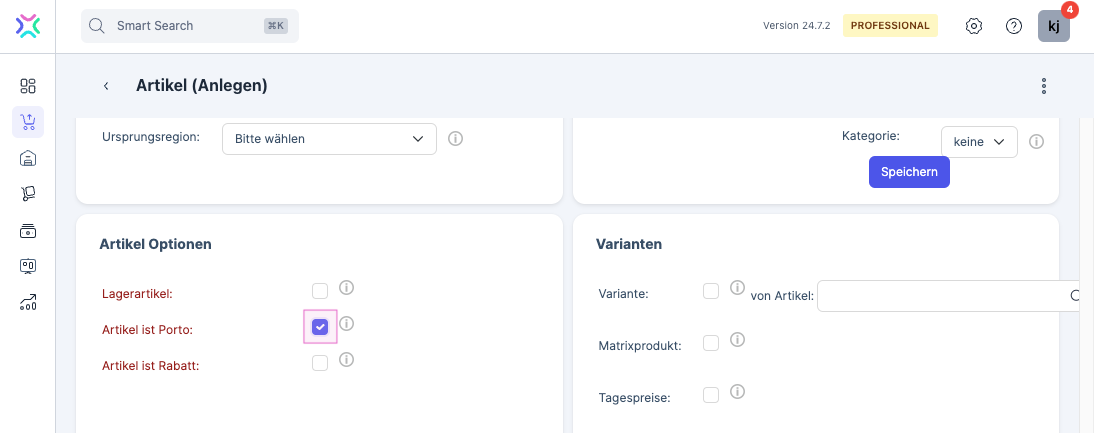 Um einen Portoartikel anzulegen folge dem Menüpfad Verkaufen > Artikel > + Artikel hinzufügen, gib einen passenden Namen und die allgemeinen Daten ein und scrolle nach unten zum Bereich Artikel Optionen. Dort setzt du das Häkchen bei “Artikel ist Porto” und speicherst anschließend.