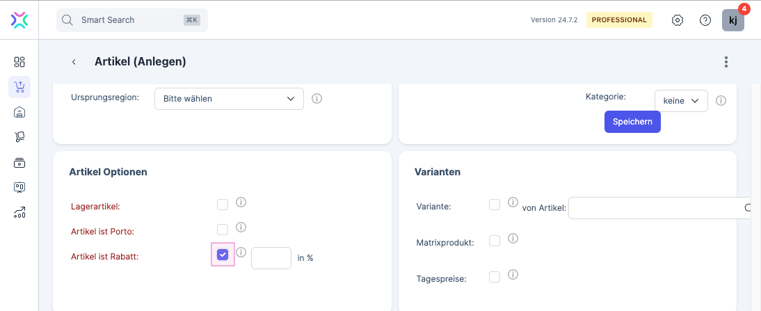 Um einen Rabattartikel anzulegen folge dem Menüpfad Verkaufen > Artikel > + Artikel hinzufügen, gib einen passenden Namen und die allgemeinen Daten ein und scrolle nach unten zum Bereich Artikel Optionen. Dort setzt du das Häkchen bei “Artikel ist Rabatt” und speicherst anschließend. Das Feld für den Prozentsatz kannst du in diesem Fall leer lassen, weil die Rabattwerte später vom Shop übergeben werden.