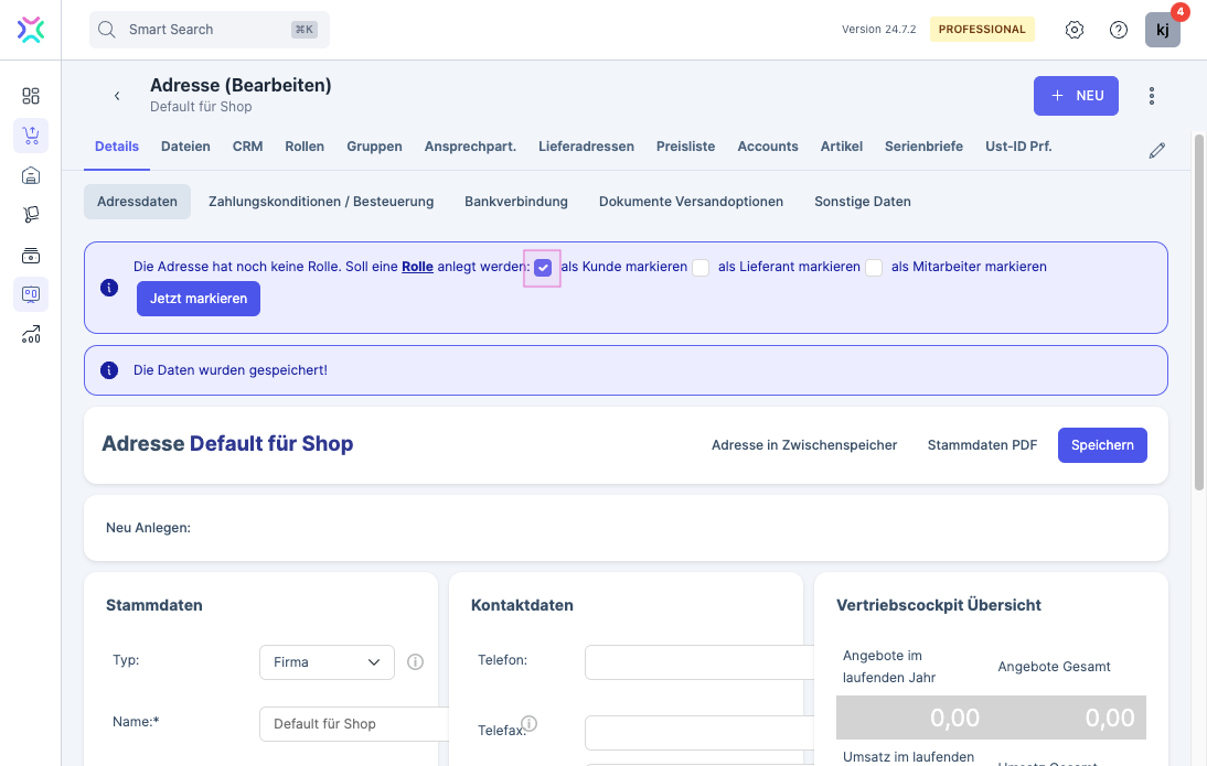 Um einen Kunden anzulegen folge dem Menüpfad Verkaufen > Adressen > + NEU, gib eine passende Bezeichnung als Namen ein und speichere anschließend den Datensatz. Nach dem Speichern wirst du gefragt, welche Rolle zugeordnet werden soll. Belasse das Häkchen bei “als Kunde markieren” und klicke auf “Jetzt markieren”.
