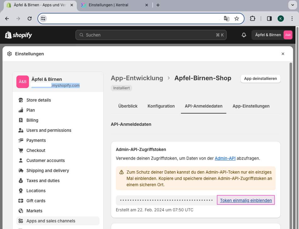 Füge den Token aus der Zwischenablage ein und tippe die URL deiner Shopify-Instanz ein: