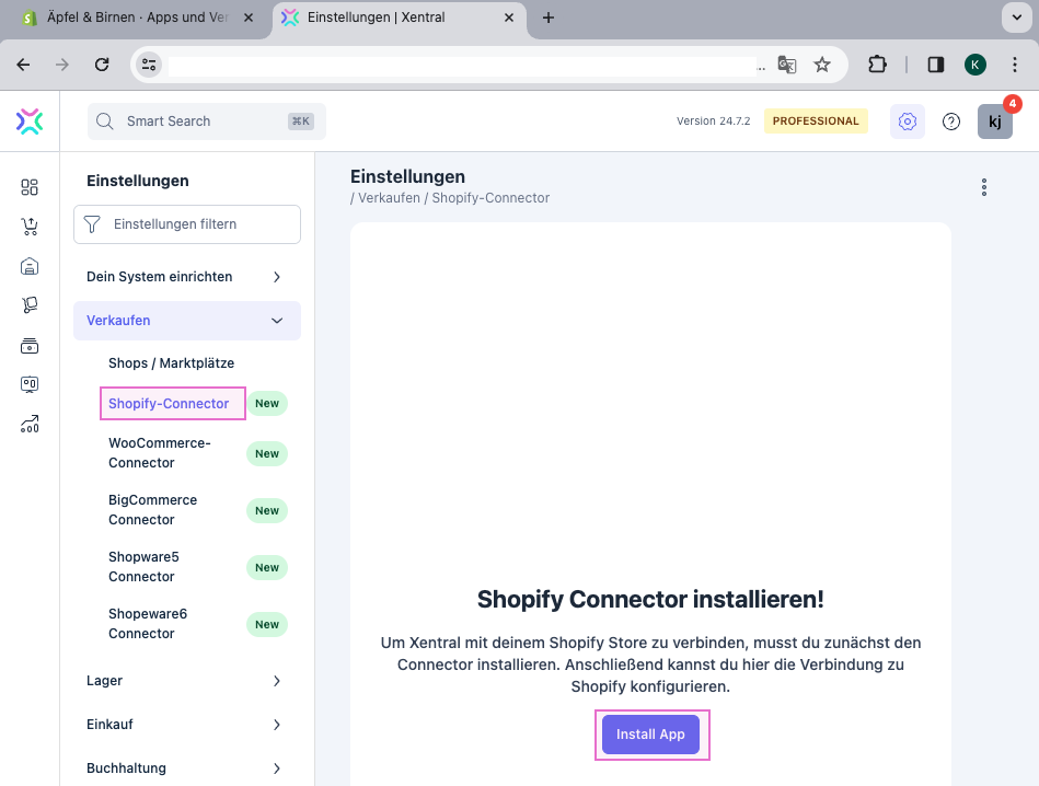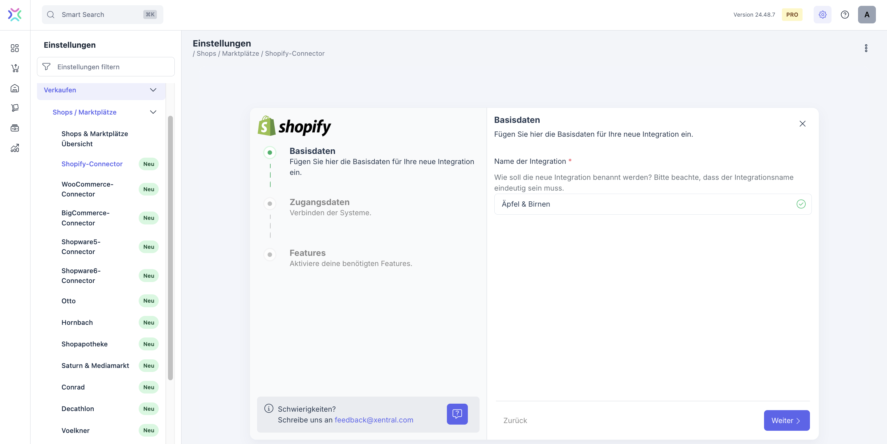 Folge dem Menüpfad Einstellungen > Verkaufen > Shops/Marktplätze > Shopify Connector.