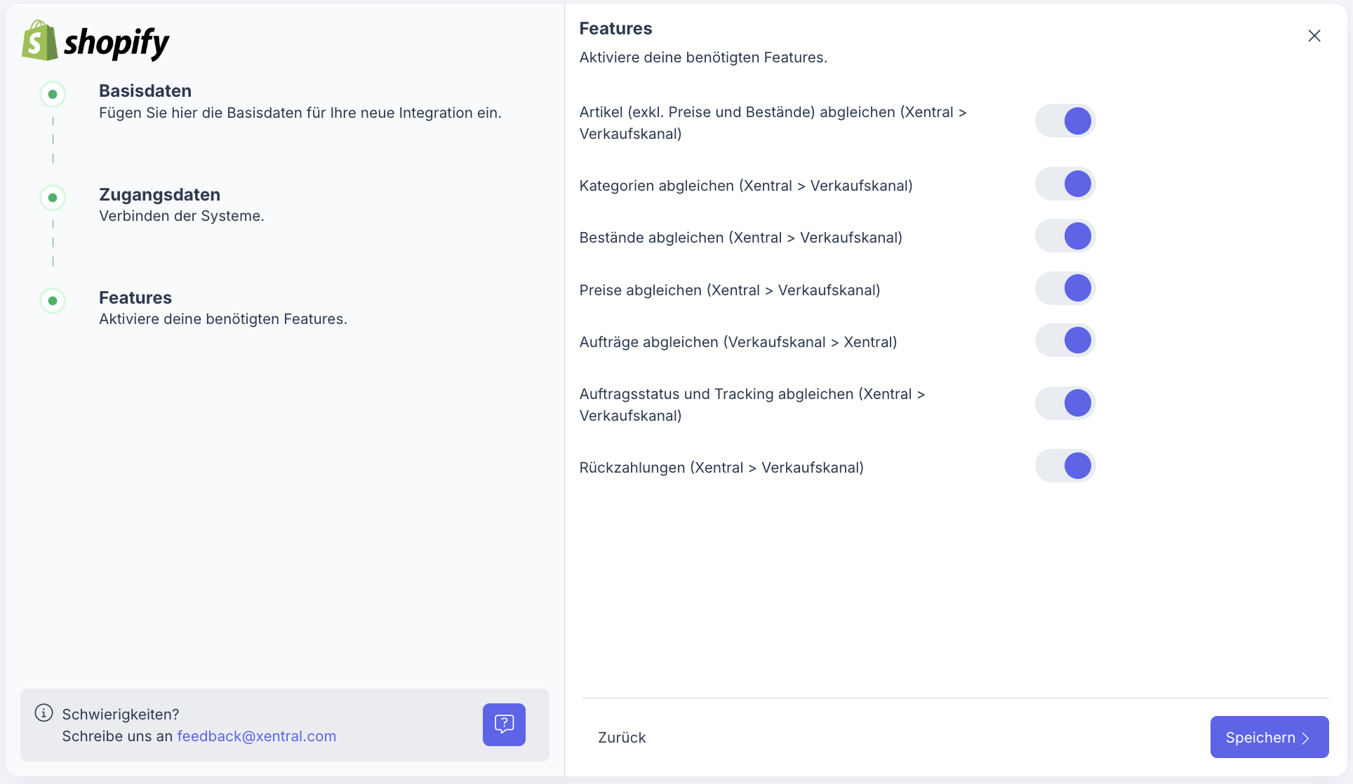Hier wählst du, welche Datentypen du grundsätzlich zwischen deinem Shop und Xentral austauschen möchtest. Wir empfehlen, alle Features zu aktivieren. Du kannst sie später einzeln in den Integrations-Modus setzen und festlegen, welche genauen Daten eines Features zwischen den Systemen ausgetauscht werden.
