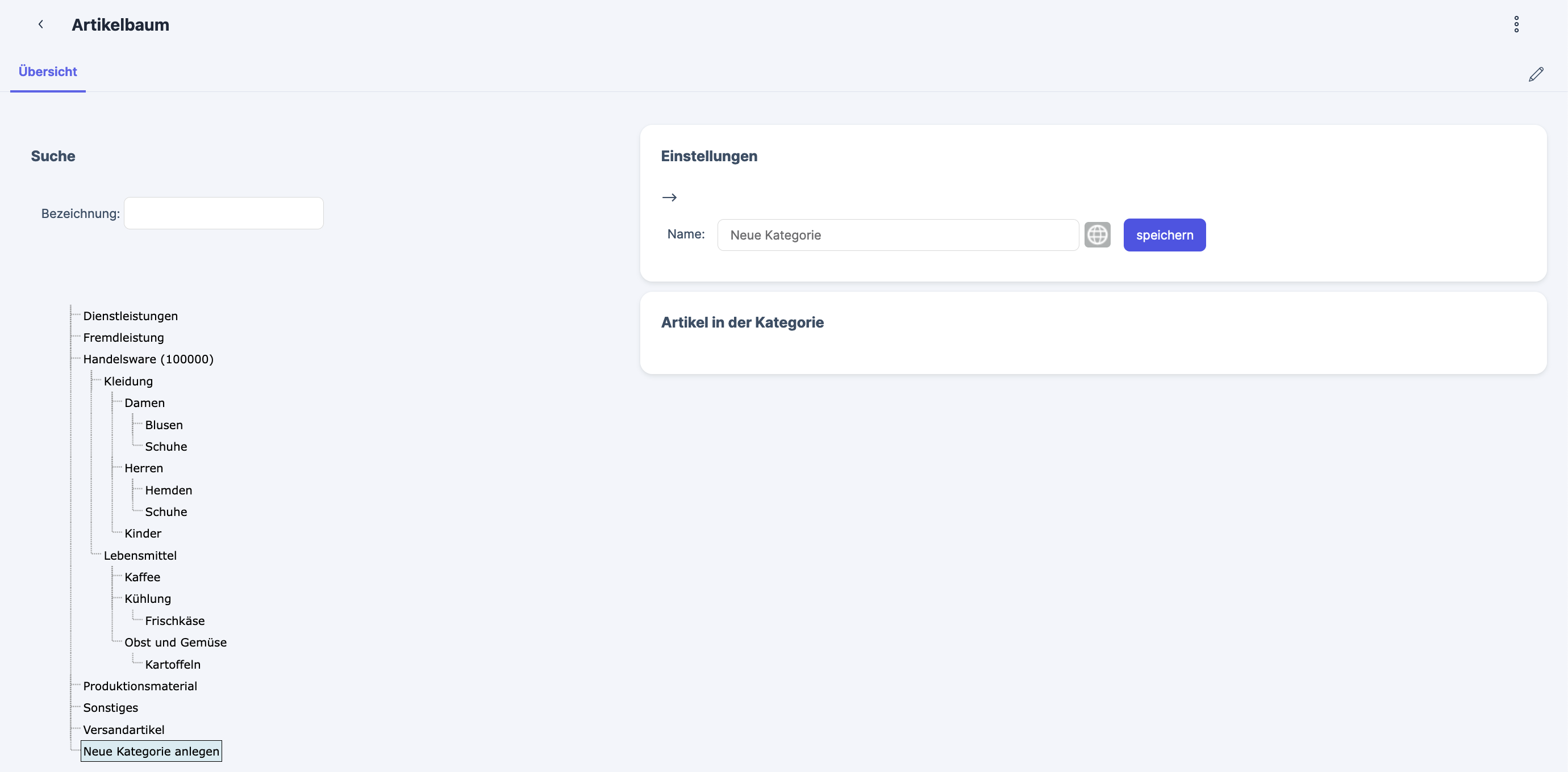 Your new product category is displayed in the item tree. The categories are always displayed alphabetically. The sorting order cannot be changed.