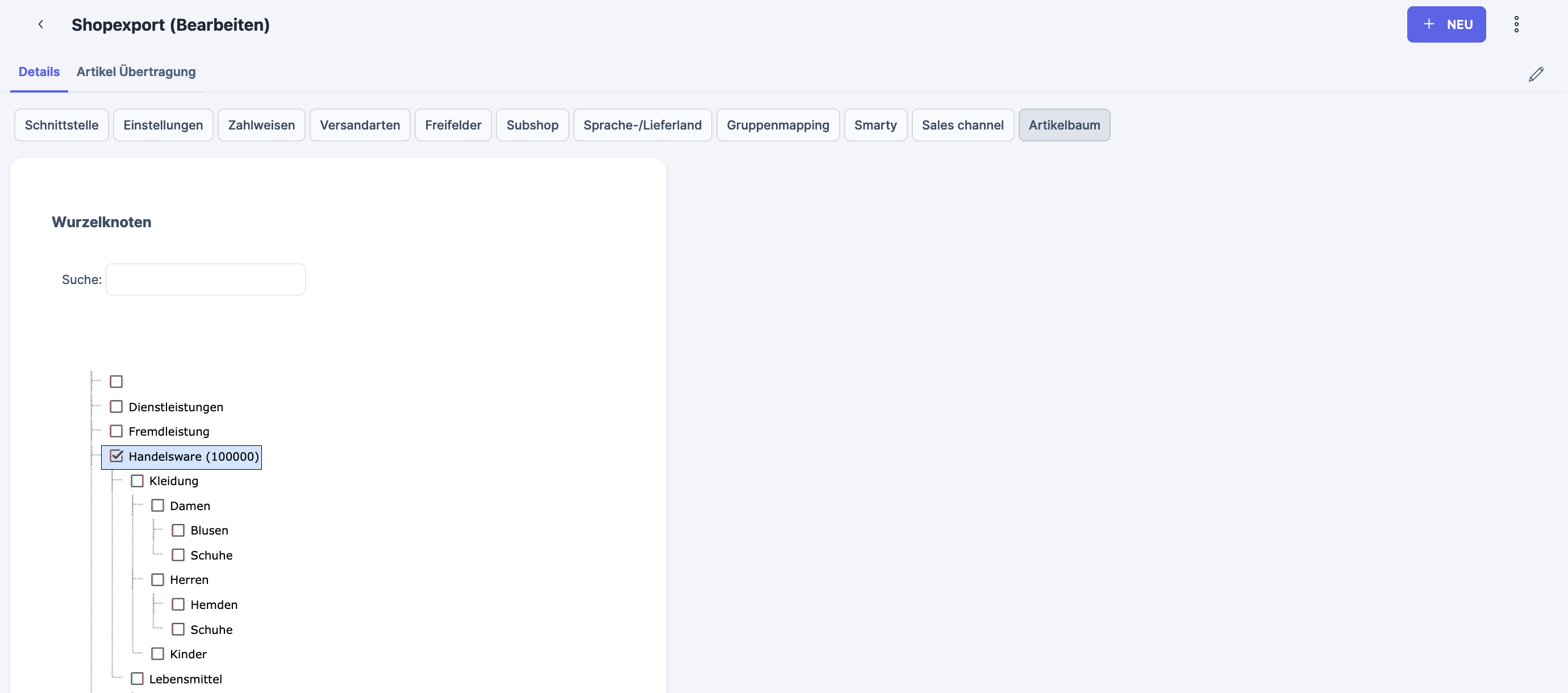 In the example in the screenshot, only categories and products that are attached to the Handelsware category will be exported to the shop. If you select the uppermost check box, every category will be exported.