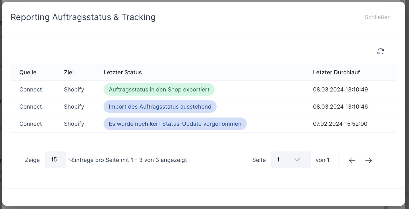 Im Reiter Auftragsstatus & Tracking siehst du den Synchronisierungsstatus deiner Auftragsstatus- und Tracking-Daten zwischen Shop und Xentral.