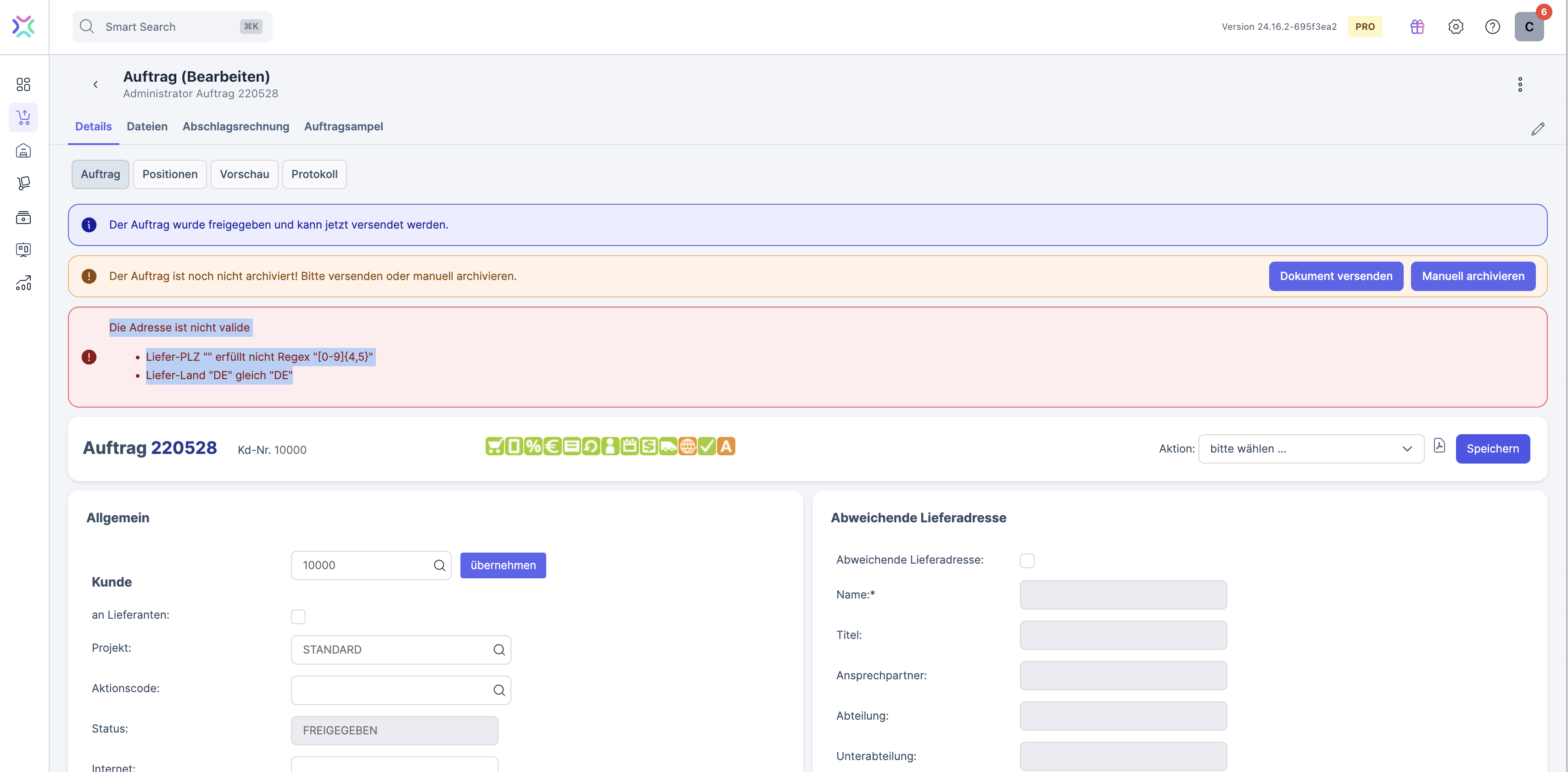 You can also deactivate validation for an address by clicking on the customer number in the sales order and manually validating the address via your free field input, see above.