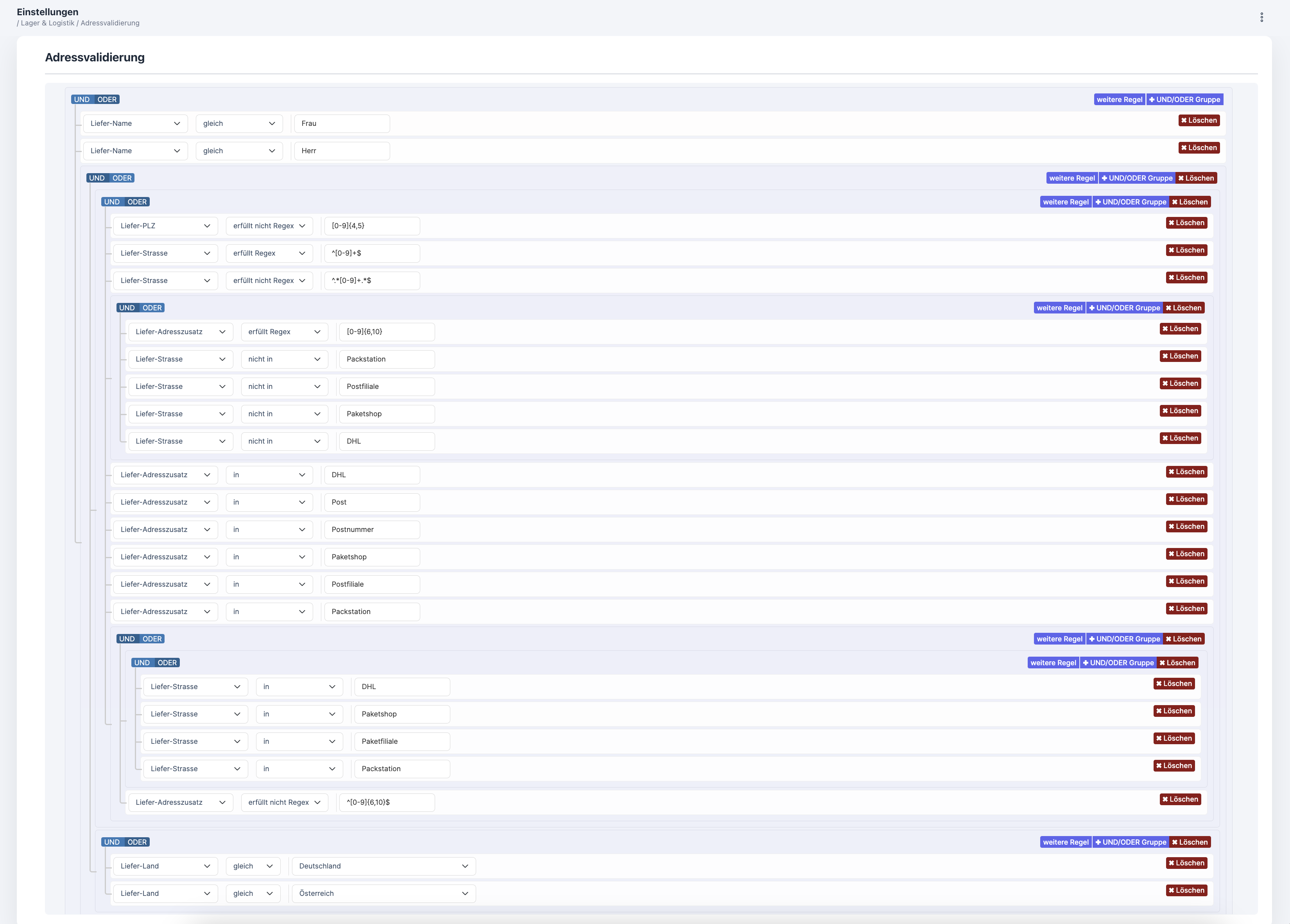 In expert mode, you can customize or expand the rules for address verification, e.g., you can add more countries or expand the terms for other service providers' parcel shops.