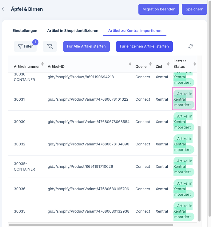Der Import beginnt unmittelbar durch Klicken auf Für Alle Artikel starten. Stelle vorher sicher, dass die Datenqualität stimmt.