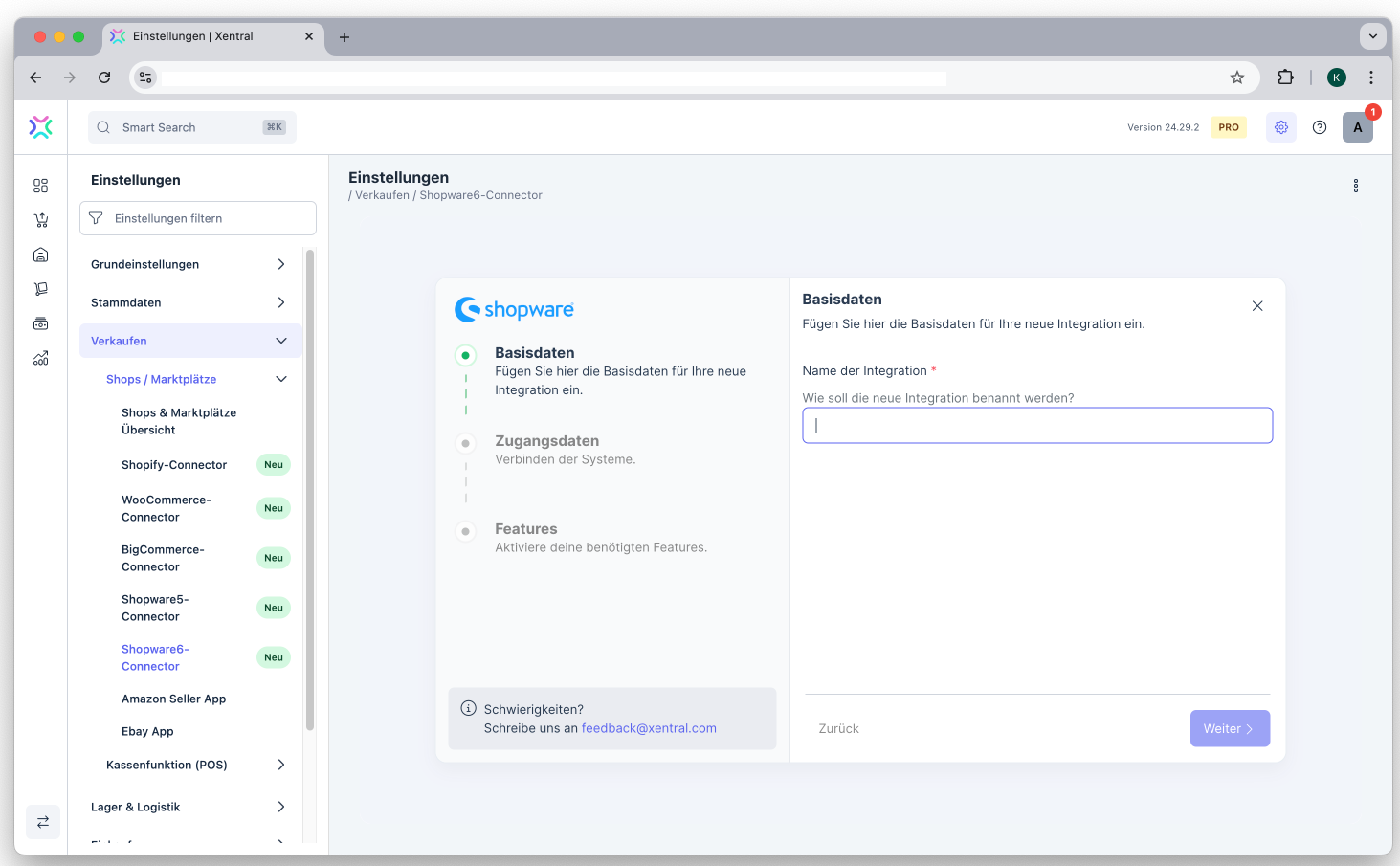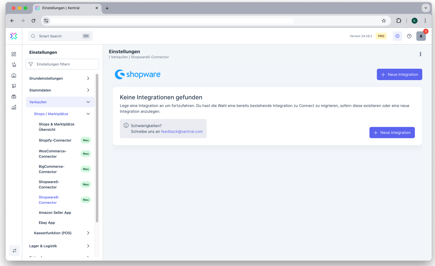 Öffne im Xentral-Fenster den Menüpfad Einstellungen > Verkaufen > Shops/Marktplätze > Shopware6 Connector und klicke auf + Neue Integration, um den Einrichtungswizard zu starten: