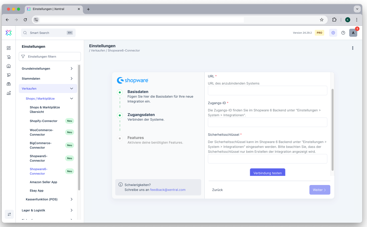 Wechsele nun zurück zum Xentral-Fenster und fahre mit den Zugangsdaten fort.