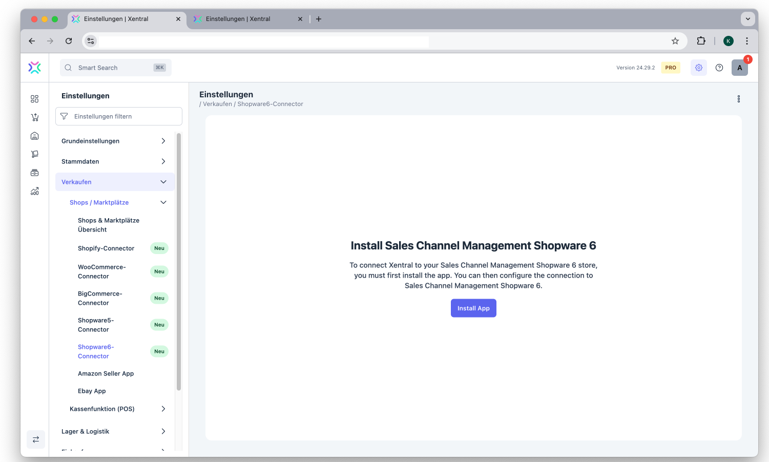 Für die nächsten Schritte benötigst du Zugriff auf beide Systeme. In Shopware 6 musst du als Administrator angemeldet sein. Wir empfehlen, die Shop-/Marktplatz-Verwaltung in einem und Xentral in einem anderen Browserfenster parallel zu öffnen.