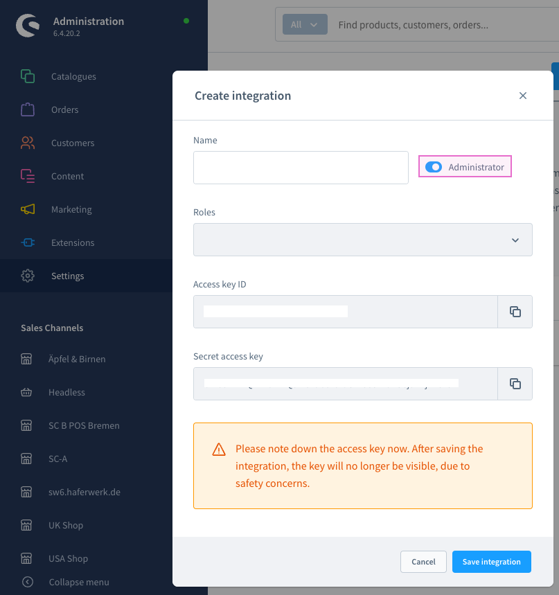 Gib einen Namen für die Integration ein, um sie identifizieren zu können und wähle Administrator aus.