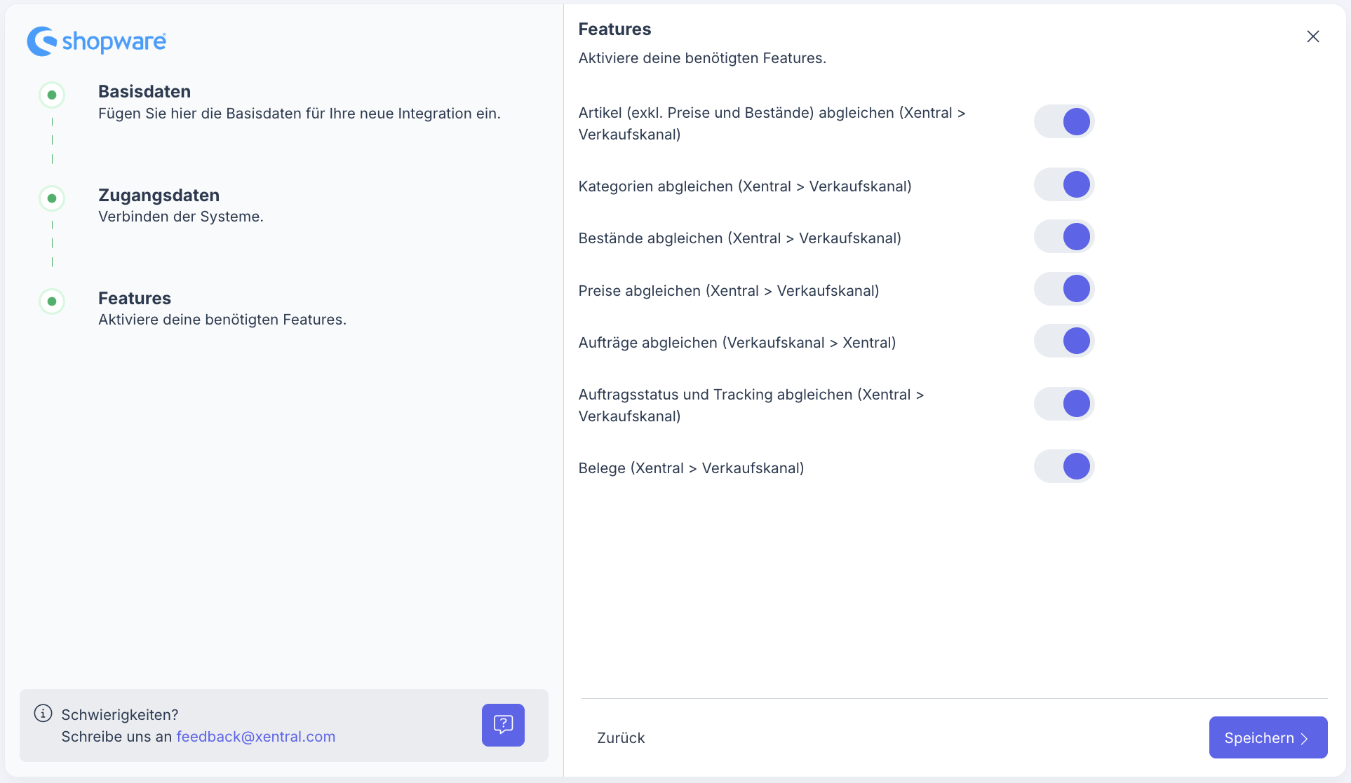 Hier wählst du, welche Datentypen du grundsätzlich zwischen deinem Shop und Xentral austauschen möchtest. Wir empfehlen, alle Features zu aktivieren. Du kannst sie später einzeln in den Integrations-Modus setzen und festlegen, welche genauen Daten eines Features zwischen den Systemen ausgetauscht werden.