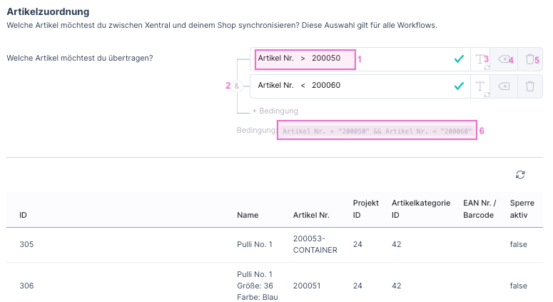 Beim Feldnamen kannst du verschiedene Felder aus Xentral nutzen. Verwende z. B. “Artikel (DE)”, um nach dem Artikelnamen zu filtern.