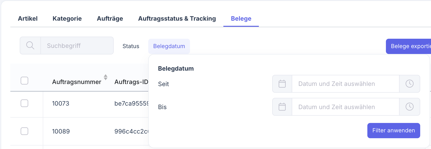 Du kannst Belege mehrerer Aufträge exportieren, indem du die Auftragsnummern durch Komma getrennt eingibst.