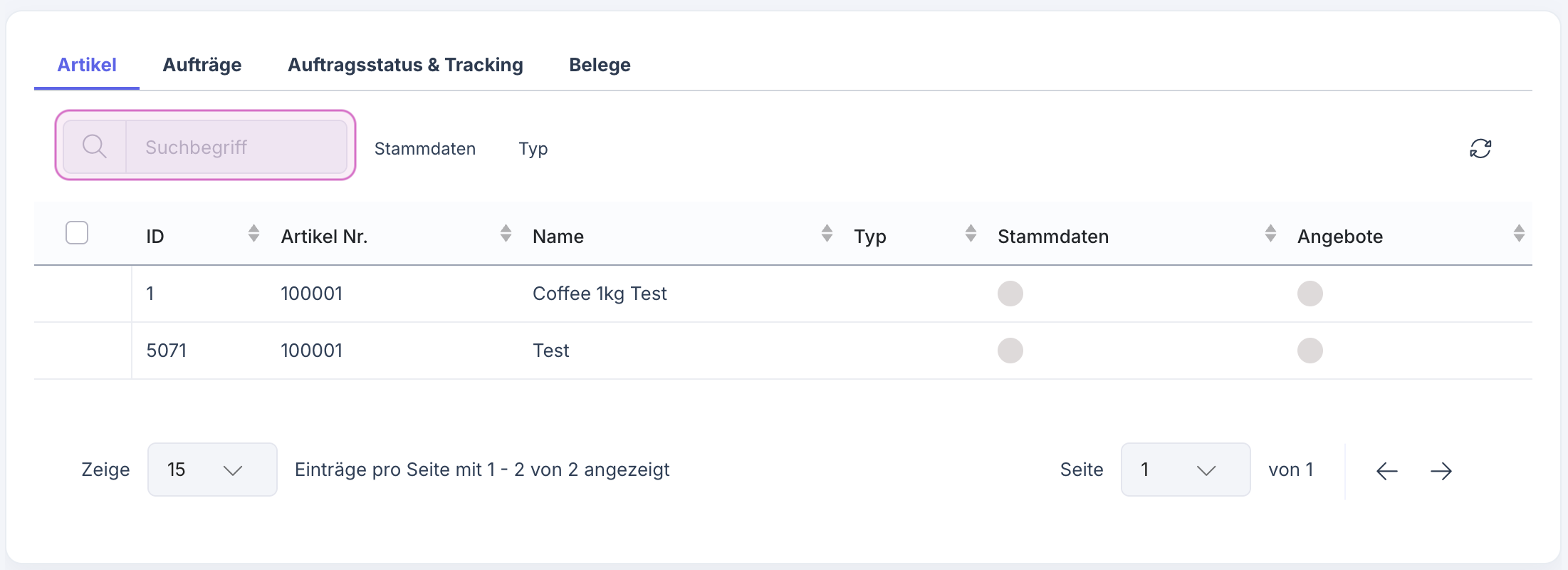 Freitextsuche: Du kannst die angezeigten Einträge über einen Freitext im Suchfeld einschränken: