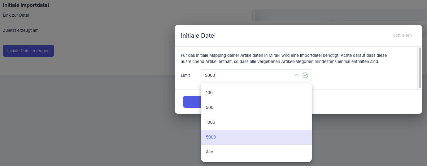 Um die initiale Angebotsdatei zu erstellen, klicke auf Initiale Datei erzeugen und wähle als Limit “Alle”.