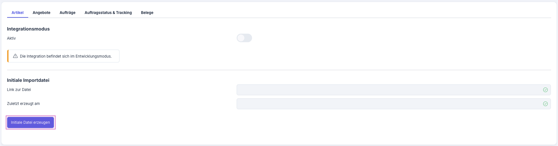 Um die initiale Artikeldatei zu erstellen, klicke auf Initiale Datei erzeugen.