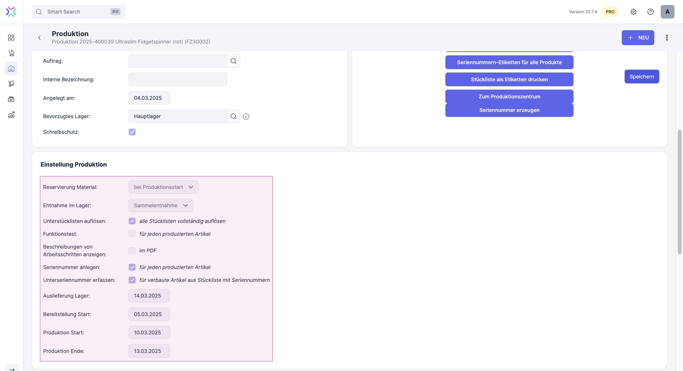 Folgende Einstellungen kannst du für eine Produktion vornehmen:
