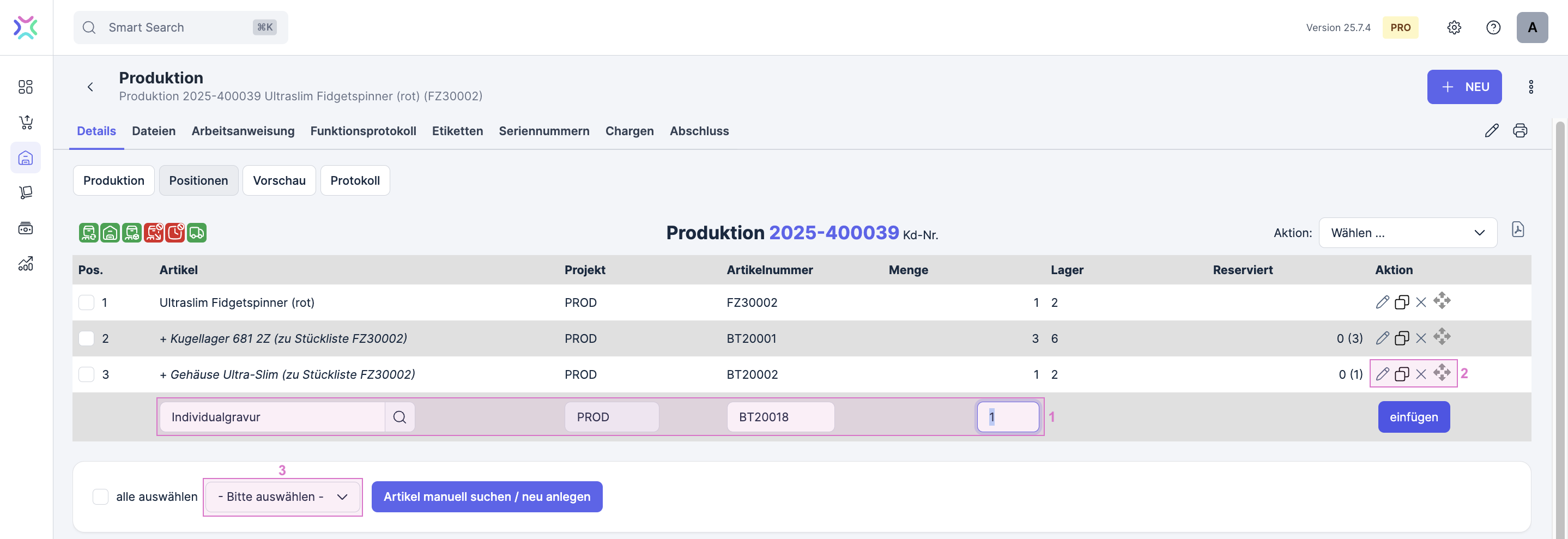 (1) Füge weitere Bauteile in die Produktionsstückliste ein, indem du einen Artikel eintippst und mit einfügen bestätigst.