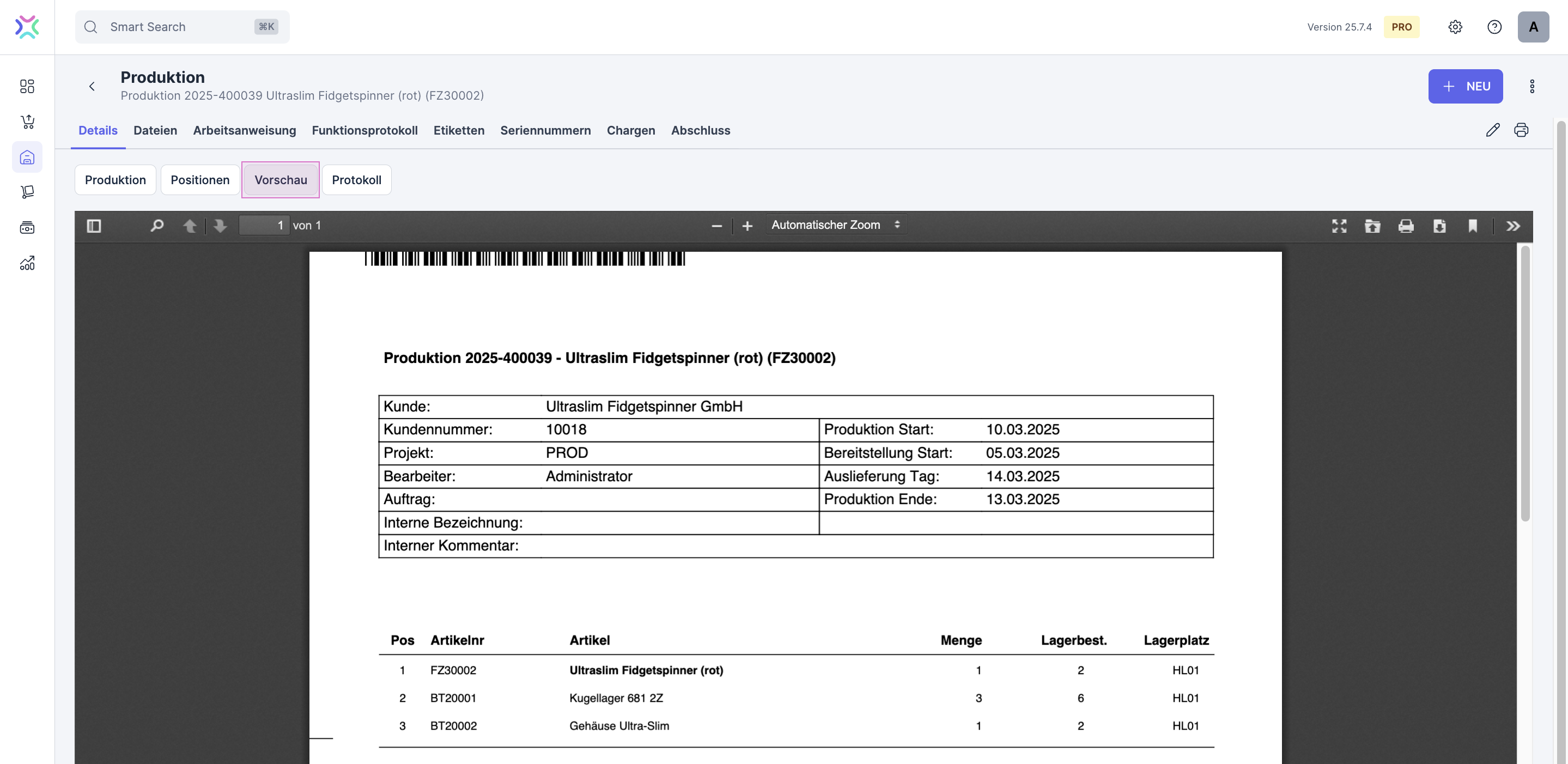 In diesem Tab kannst du die Produktion als Druckvorschau betrachten. Generell findest du auf der ersten Seite des Ausdrucks die Kopfdaten und die Produktionsstückliste und auf der/n Folgeseite/n die Arbeitsanweisung.