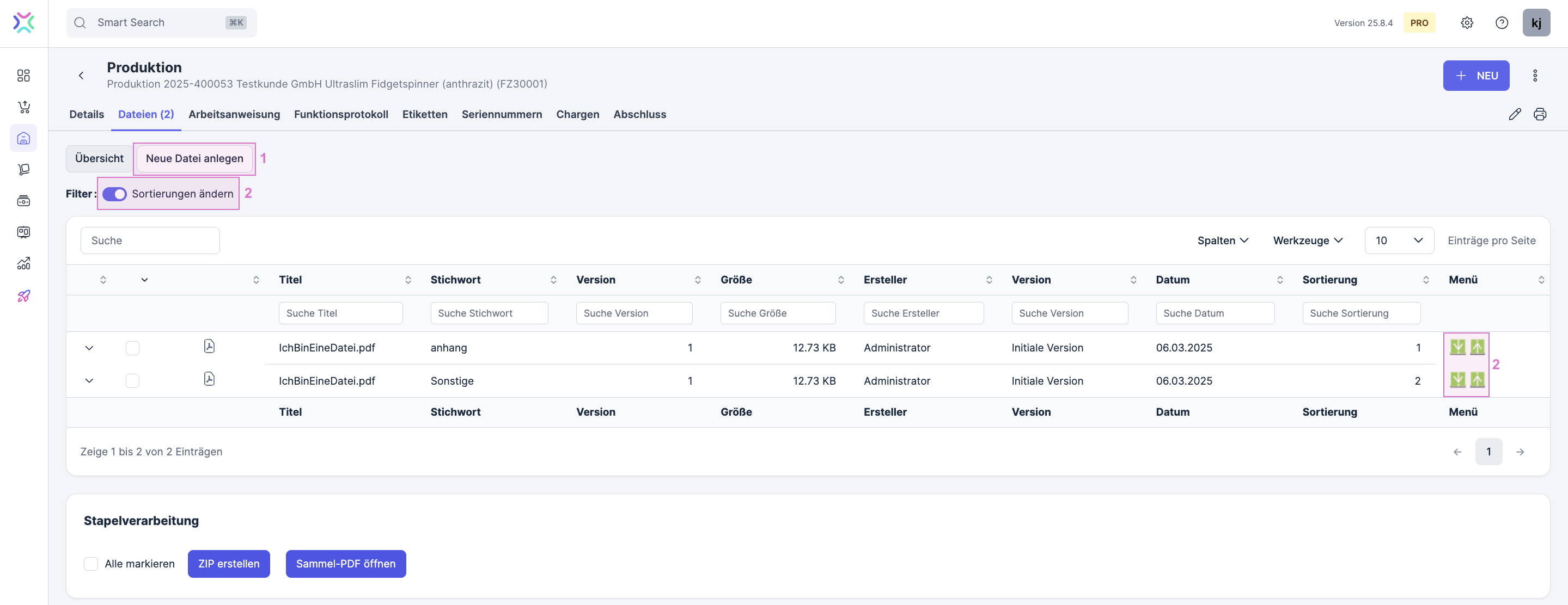 Um neue Dateien an die Produktion anzuhängen, klicke auf Neue Datei anlegen (1). Bei aktivierter Schaltfläche (2), kannst du die Sortierung von Dokumenten über die Pfeiltasten ändern.
