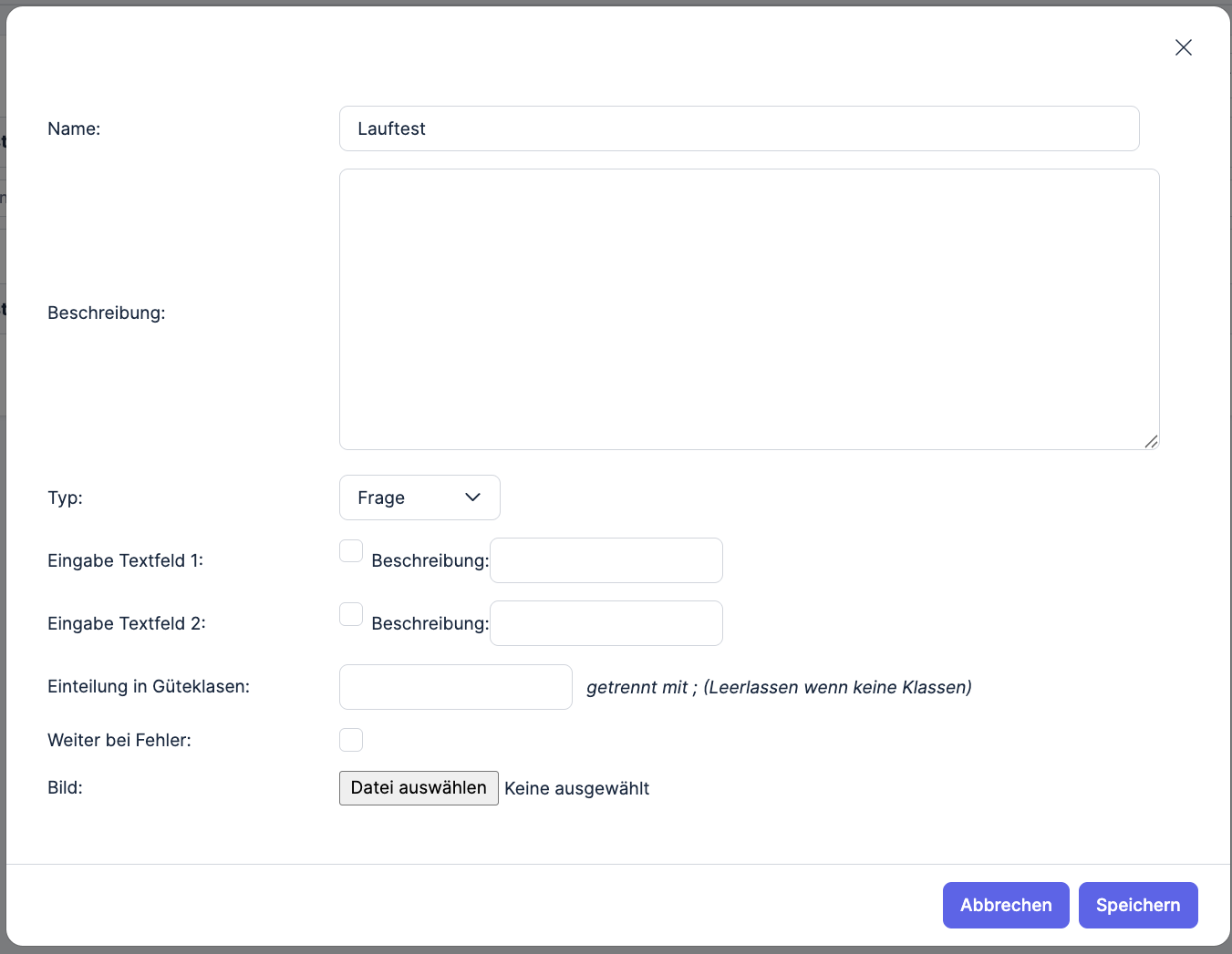 In der Detail-Ansicht (2) kannst du die einzelnen Schritte präzisieren: Du kannst z. B. den Test-Typ bestimmen, eigene Textfelder definieren oder Güteklassen eintragen, sobald du eine entsprechende Rückmeldung erhälst: