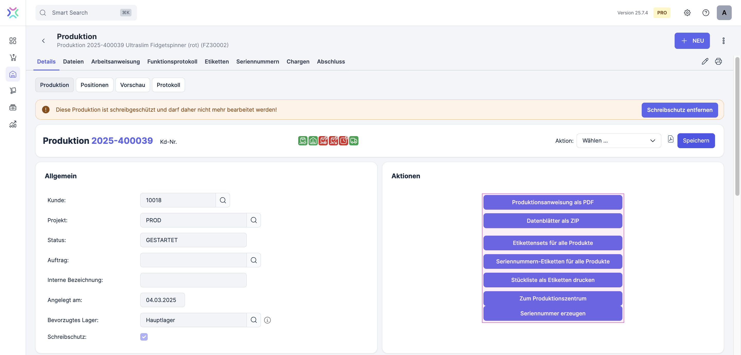 Status: Dieses Feld zeigt den Status der Produktion an.