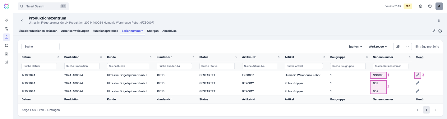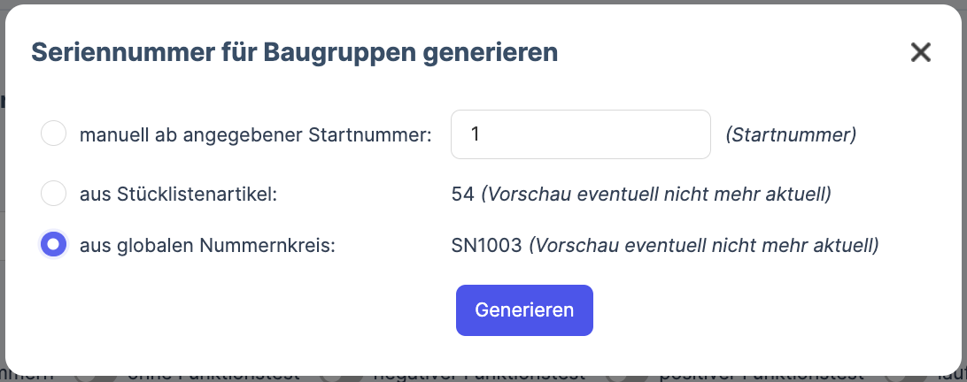 Seriennummer generieren: Hier kannst du ein Menü öffnen, mit dem du eine Seriennummer für das Erzeugnis generieren kannst:
