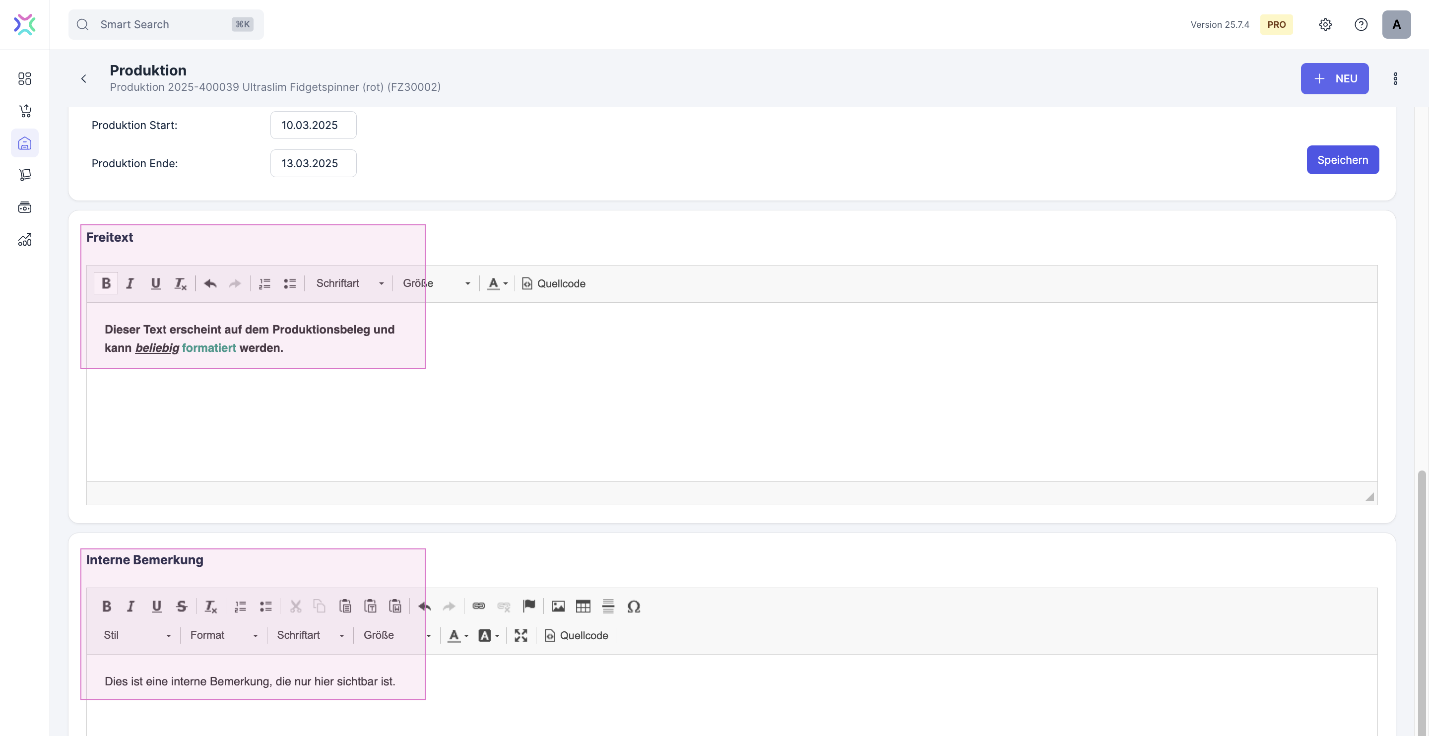 Interne Bezeichnung: Dieses Feld kannst du nutzen, um die Produktion intern zu identifizieren oder um eigene kurze Notizen einzutragen. Die interne Bezeichnung wird in der Produktionsübersicht unterhalb der Produkt-Bezeichnung und im Produktions-PDF angezeigt.