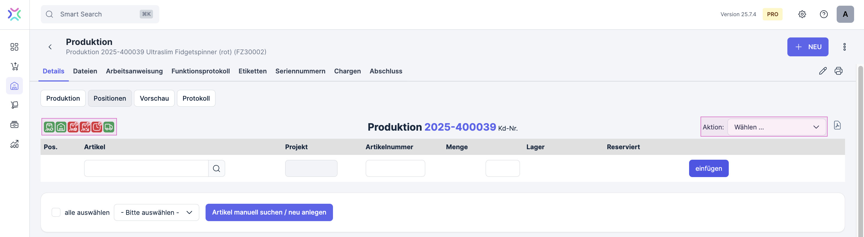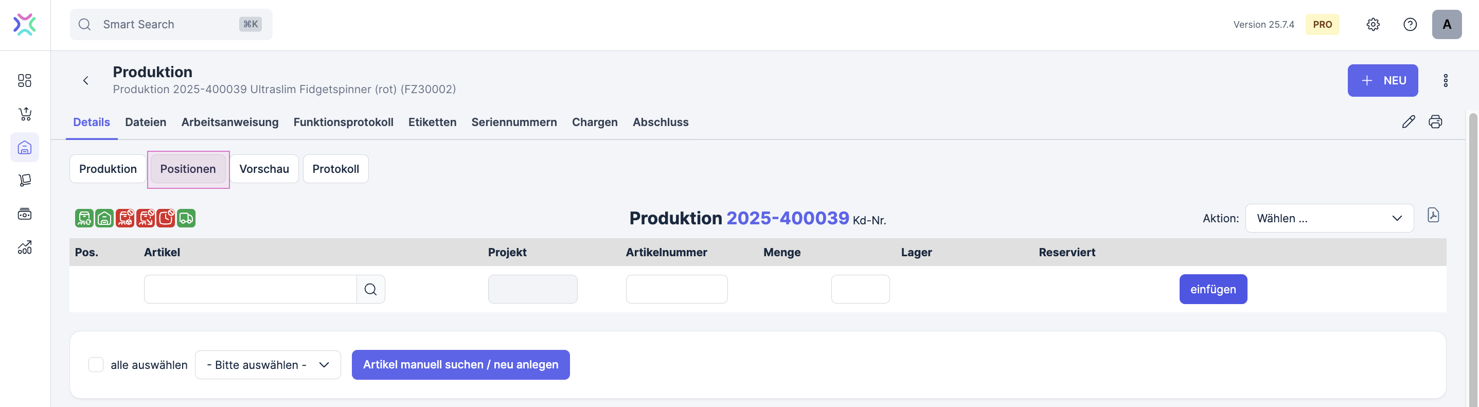 Alle Positionen löschen: Mit dieser Funktion kannst du die Positionen mit einem Klick löschen. Die Kopfdaten der Produktion bleiben unverändert.