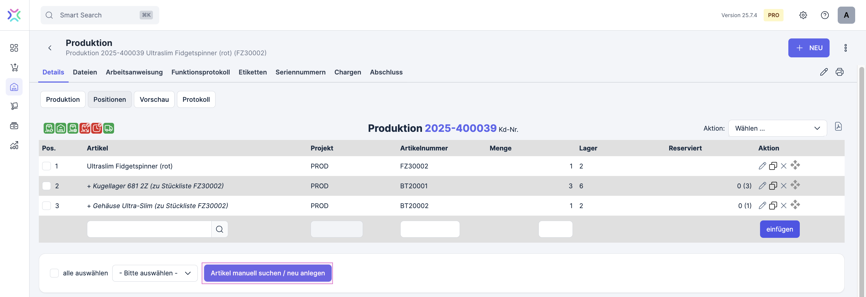Hier findest du die Produktionszeilen. Tippe die Artikelnummer des zu produzierenden Erzeugnisses in die Spalte “Artikel”. Wenn du mehr als ein Stück in dieser Produktion herstellen möchtest, passe die Menge an, ansonsten belasse sie auf 1. Bestätige mit einem Klick auf einfügen.