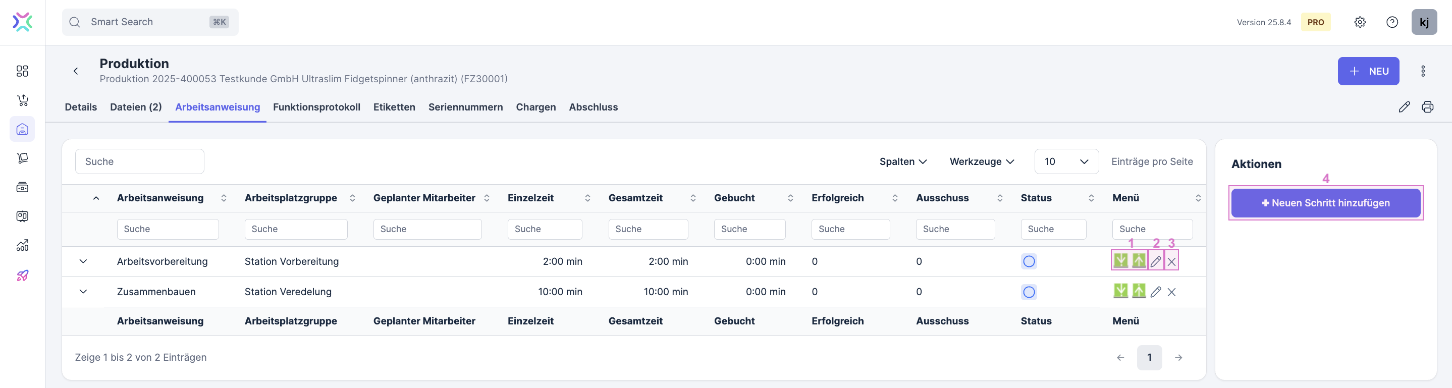 Sofern du im Artikel des Erzeugnisses eine Arbeitsanweisung angelegt hast, wird sie hieran geladen. Du erhälst so einen Überblick über alle geplanten Arbeitsschritte dieser Produktion und deren Status. Mit (1) kannst du die Reihenfolge der Schritte ändern, unter (2) kannst du weitere Details bearbeiten mit (3) und (4) kannst du Schritte löschen bzw. neue hinzufügen.