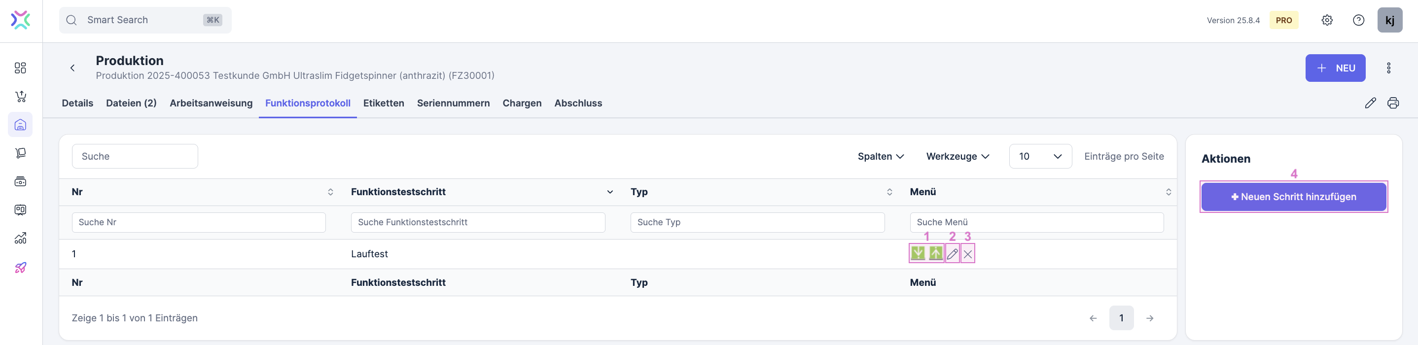 Sofern du im Artikel des Erzeugnisses ein Funktionsprotokoll angelegt hast, wird es hieran geladen. Du erhälst so einen Überblick über alle geplanten Prüfschritte dieser Produktion und deren Status. Mit (1) kannst du die Reihenfolge der Schritte ändern, unter (2) kannst du weitere Details bearbeiten mit (3) und (4) kannst du Schritte löschen bzw. neue hinzufügen.